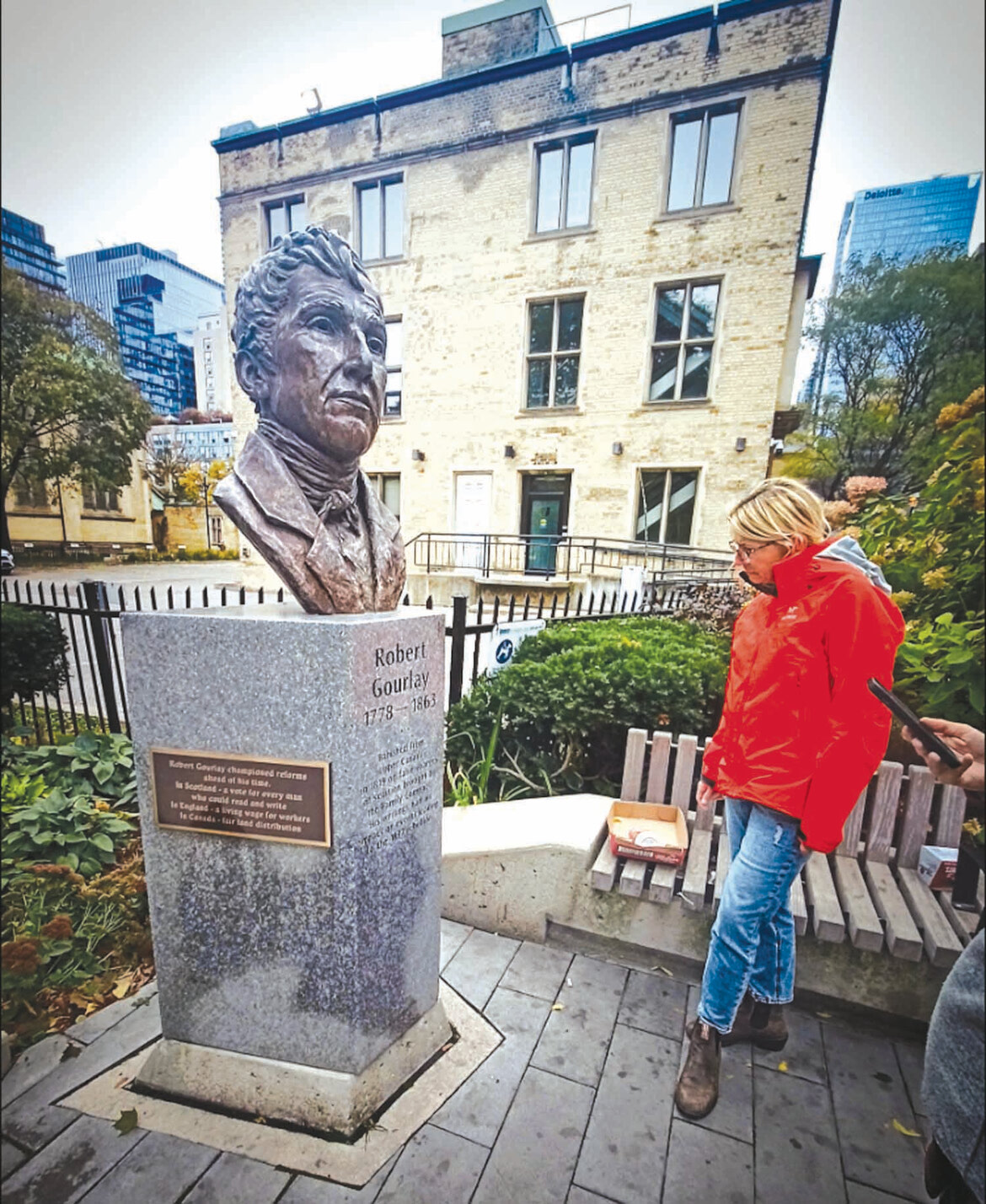 Один из моих любимых памятников - бюст Роберта Гурли работы Адриенны Элисон (2004). Он стоит в парке Сент-Джеймс и словно наблюдает за вами, когда вы проходите мимо. На гранитном постаменте написано: «Изгнан из Верхней Канады в 1819 году по ложным обвинениям в подстрекательстве к мятежу, выдвинутым Семейным договором. Его труды оказали влияние на события, приведшие к восстанию 1837 года».